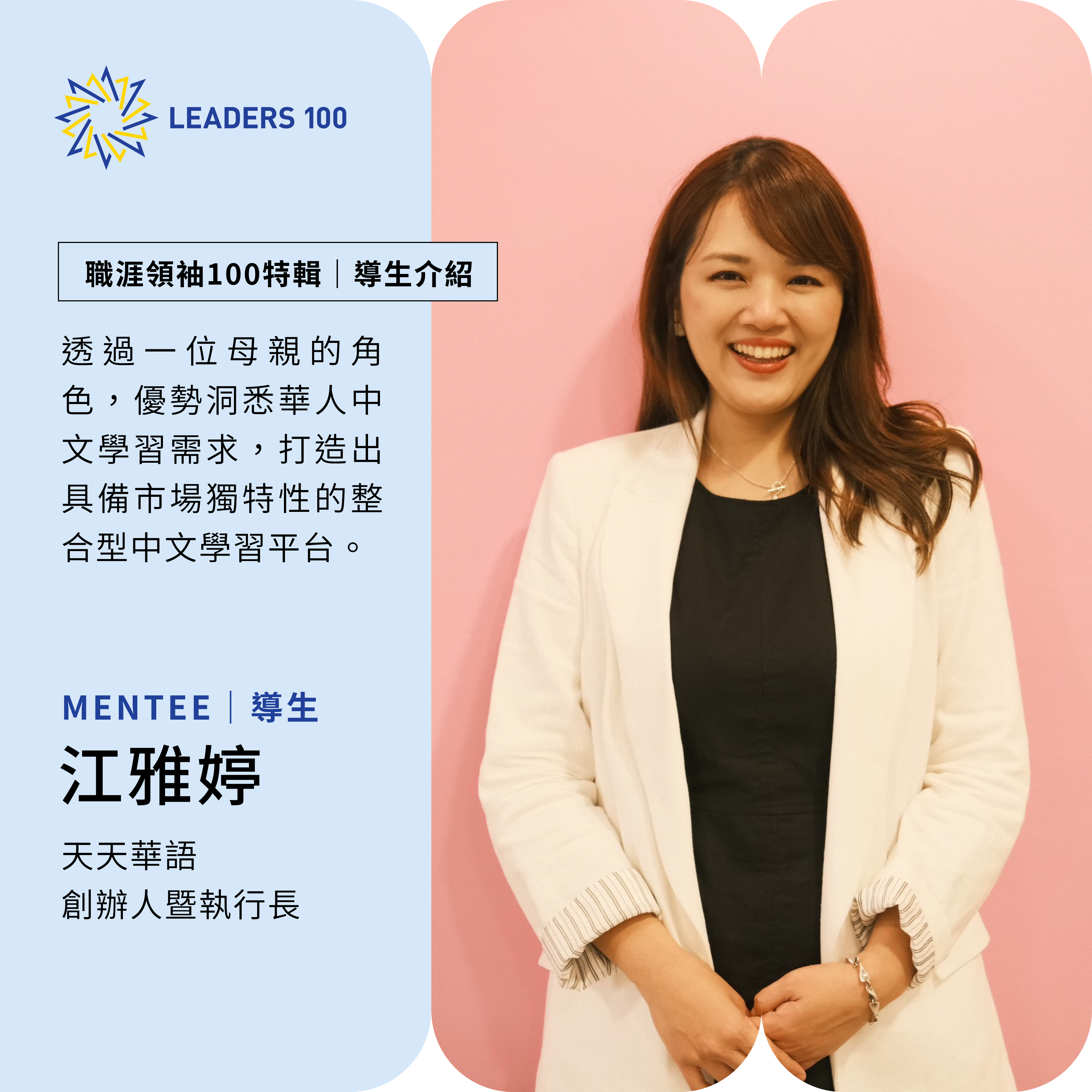 leaders100world2024-12-31T16:55:40+08:00Sunny的蛻變之路:在領袖100中重拾初心與勇氣! 訪談者 導生:Vic & Boky 2024-09-23 Sunny |電商及零售業 / 副總經理 從高階主管到自我突破:Sunny 的職涯轉折之旅 在十年職涯中,Sunny 勇敢接受挑戰,從企業草創到高階主管,探索過後端營運到營收前線的每一個環節。年紀輕輕,她便躍升為上市公司的副總,這樣的成就令人讚嘆。然而,隨著職位攀升,她也面臨著新的挑戰。 長期待在同一個產業,使她較少認識其他領域,當公司遭遇瓶頸時,她不禁懷疑自己是否能做出全方位的最佳決策。同時,她內心的初衷逐漸浮現:她想要的不只是幫助公司,而是發揮更大的社會影響力,實現真正地助人。 命運的契機—領袖100計畫 就在她努力尋求自我突破時,一次與業務主管的閒聊,不經意地為她開拓了一條嶄新路徑。對方提到「領袖100計畫」,一個聚集各領域精英,由導師為導生提供職涯指引的組織。這一計畫宛如命運的指引,為 Sunny 提供了打開新世界的鑰匙。她意識到,這或許正是自己需要的支援:一個能在職涯中提供多元視角、助她理清思路的平台。於是,她毫不猶豫地加入,希望能在這裡找到新的方向。 與人生引路人同行:數位轉型顧問李全興 在領袖100裡,Sunny 與導師李全興-查叔結緣。她形容查叔是「身經百戰、閱歷豐富的大前輩」,如同一盞為她點亮前方道路的燈。每隔1至2個月,他們便會共進晚餐,輕鬆交流近況。起初,她以為這會是一個設定目標、追蹤進度的專案式指導,然而,導師給她的遠不止如此。Sunny 正處於重新探索自我可能性、了解不同產業的階段,而查叔的陪伴就像一面鏡子,讓她看見自己忽略的視角,並提醒她在思考時的盲點。 突破內在關卡:從緊繃到心態開闊 加入領袖100計畫的初期,Sunny 充滿焦慮與不安。她擔心自己過去十年的經歷,無法支撐起未來的發展。她迫切地想了解不同產業,探索助人的可能性,並且希望能證明自己,可以在新領域中走得更遠。然而,導師的一句話令她豁然開朗:「人生沒有標準答案,不可能什麼都是100%確定的。」這句話令她卸下內心追求完美的重擔,學會在探索中放慢腳步,允許自己在摸索中前進。 半年後,Sunny 不再一味追求完美,而是學會一步一腳印地去嘗試。她漸漸開始投入助人領域,參與跨產業交流,拓展視野,逐漸打破自己長年以來固有的思維模式。導師不給她標準答案,而是陪她一起反思、提問,讓她看見更多的可能性,讓她在摸索中找到自己的路。 在領袖100中的無價收穫與啟發 Sunny 最深刻的印象,是在領袖100面試的那天。當時,她與一群有著類似職場瓶頸的夥伴坐在一起,坦然分享自己在經營角色中遇到的挑戰。那一刻,她感到自己並不孤單,終於找到了同路人。如今,她不僅從導師的陪伴中獲得了更廣闊的視野,也在與其他領域精英的交流中,獲得了難得的啟發和成長。 給正在面臨挑戰的你:勇敢走出來,找到突破的力量 如果你也在職涯的轉折點上徘徊,渴望突破現狀、擴展自身的影響力,「領袖100計畫」會是你最佳的選擇。在這裡,你會遇見引領你前行的導師,找到一群勇於探索、渴望成長的夥伴。 勇敢跨出那一步,加入領袖100,你將發現更廣闊的未來! JOIN US 2025 年 準備好遇見自己的職涯貴人 申請加入